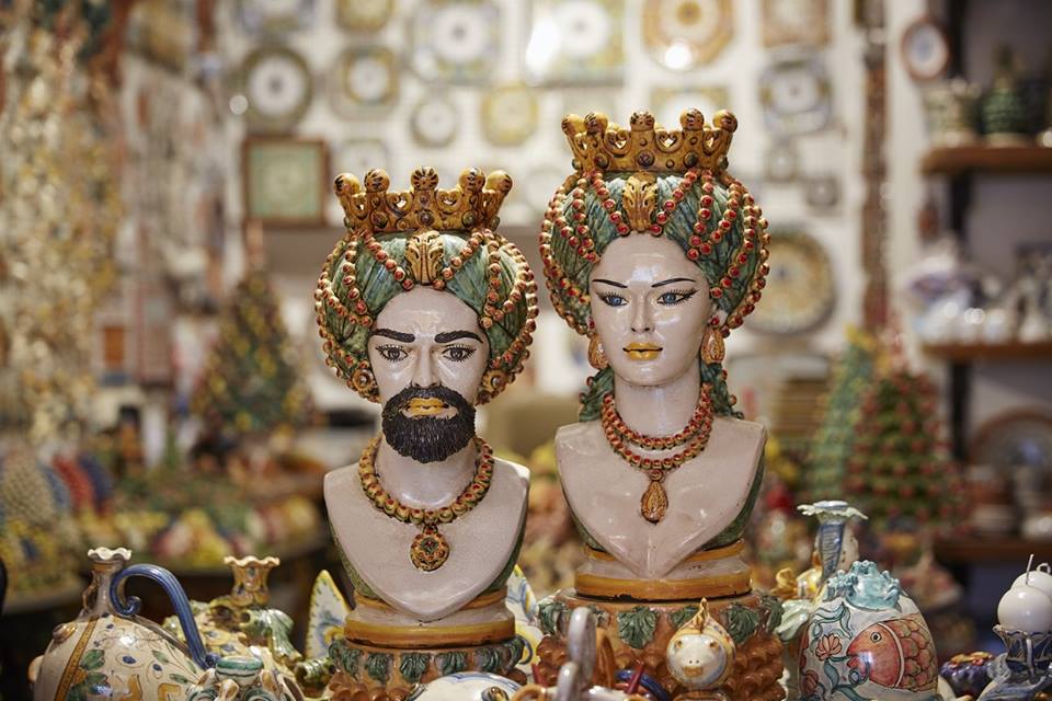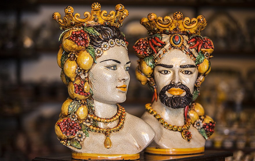 Passeggiando per le vie delle città siciliane non si possono non notare dei visi dall’espressione solenne e melancolica fare capolino da balconi e finestre. Diventati un simbolo della tradizione sicula per eccellenza, si tratta delle cosiddette “teste di moro”. Celebri sono quelle di Caltagirone, preziose quelle di Taormina, ma se ne trovano in ogni dove. Per i turisti, affascinati da questi vasi dalle fattezze curiose, è d’obbligo procurarsene una come souvenir da un viaggio in Sicilia. Molti le acquistano per farne sfoggio nei propri salotti ed impreziosire il centrotavola. Pochi però ne conoscono il significato e l’origine, che nasconde una storia tanto tragica quanto sanguinaria, in cui l’amore, la passione e la vendetta fanno da protagoniste. Di inequivocabile tradizione siciliana, le teste di moro sono vasi di fine ceramica dipinta e realizzati dalle mani esperte degli artigiani dell’Isola. Raffigurano il viso di un arabo, riconoscibile dai tratti mediorientali e dal colore scuro della carnagione, sulla cui testa è posta una corona. Possono cambiare dettagli: colori, smalti, forma dei tratti somatici, eventuali baffi e barba, elementi decorativi, stile. Si suole trovarli in coppia (uomo-donna) e sono un elemento di decorazione per interni ed esterni.