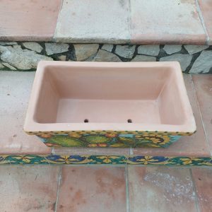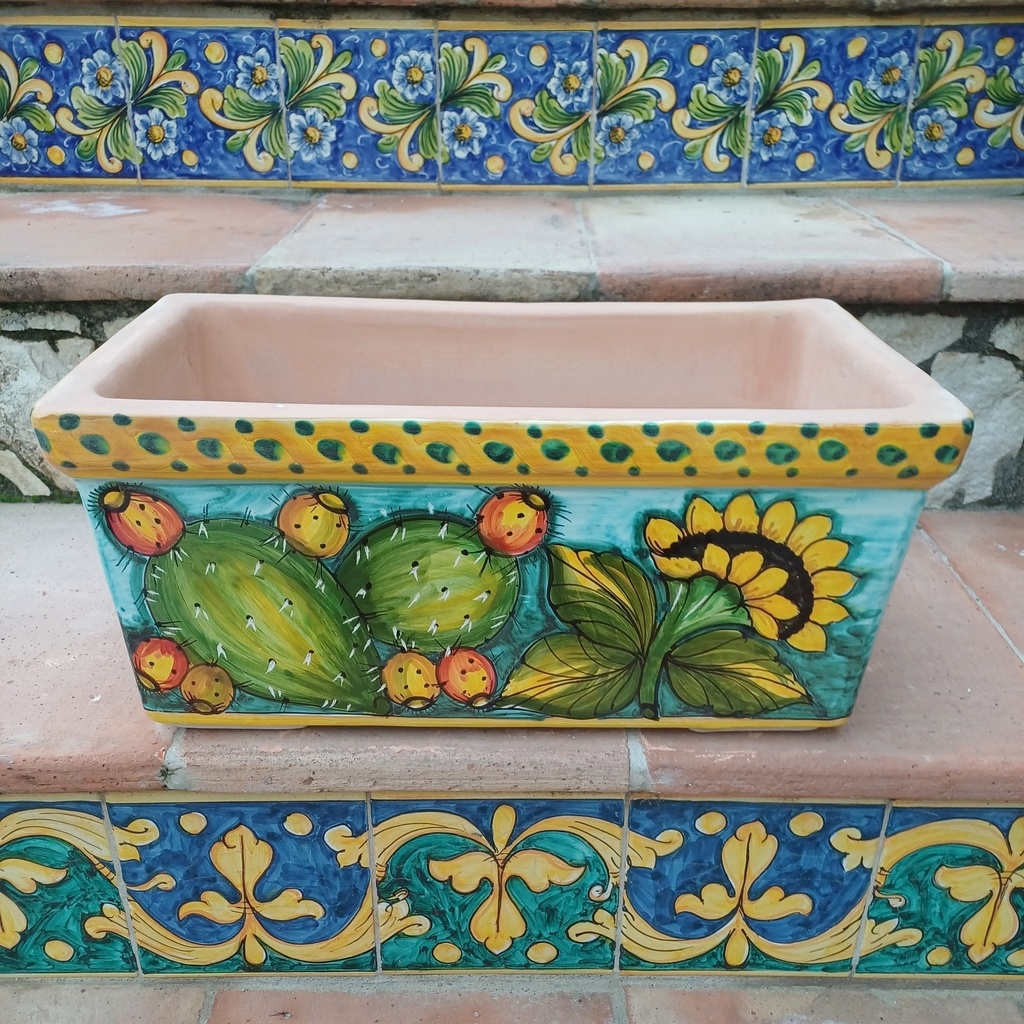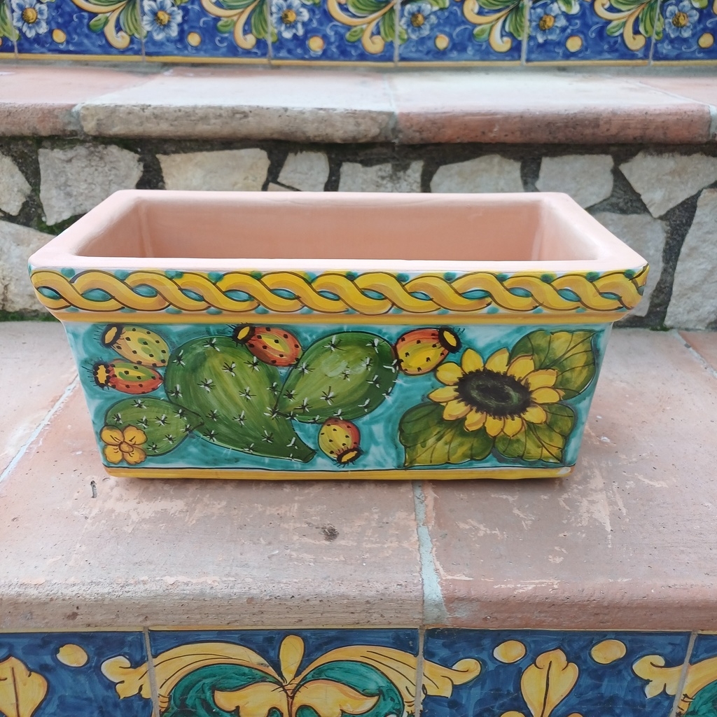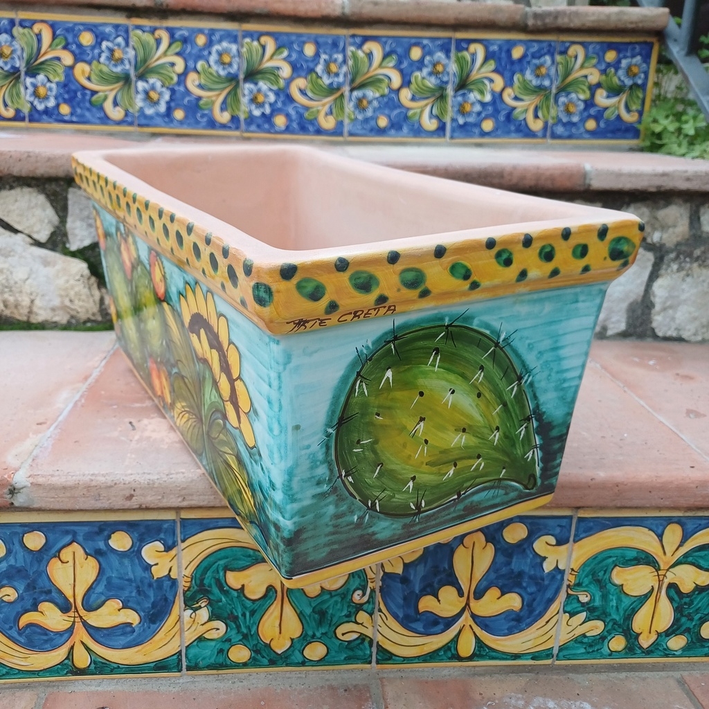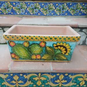 cassetta porta vaso rettangolare decoro fichi d’india e girasoli cm.42×23 h.20cm. Ceramiche realizzate a mano, in maniera del tutto artigianale, da Arte Creta – Ceramiche Artistiche Siciliane – Caltanissetta, Sicilia.