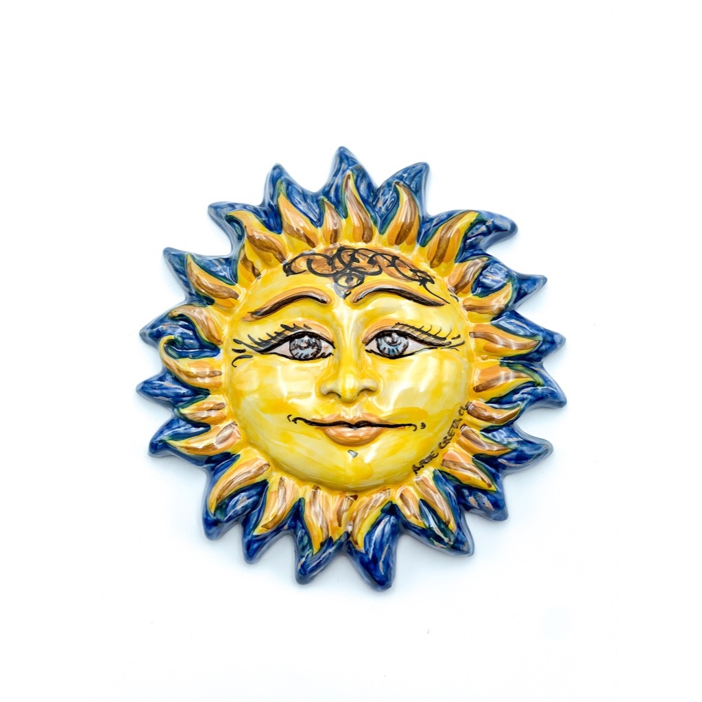 Sole Ceramica Raggi Fuoco decoro blu diametro 17 cm. Ceramiche realizzate a mano, in maniera del tutto artigianale, da Arte Creta – Ceramiche Artistiche Siciliane – Caltanissetta, Sicilia.