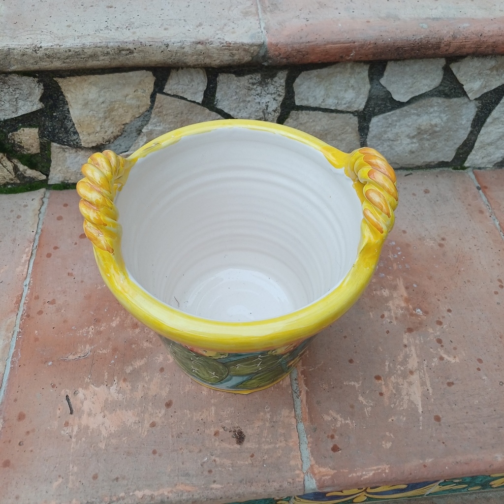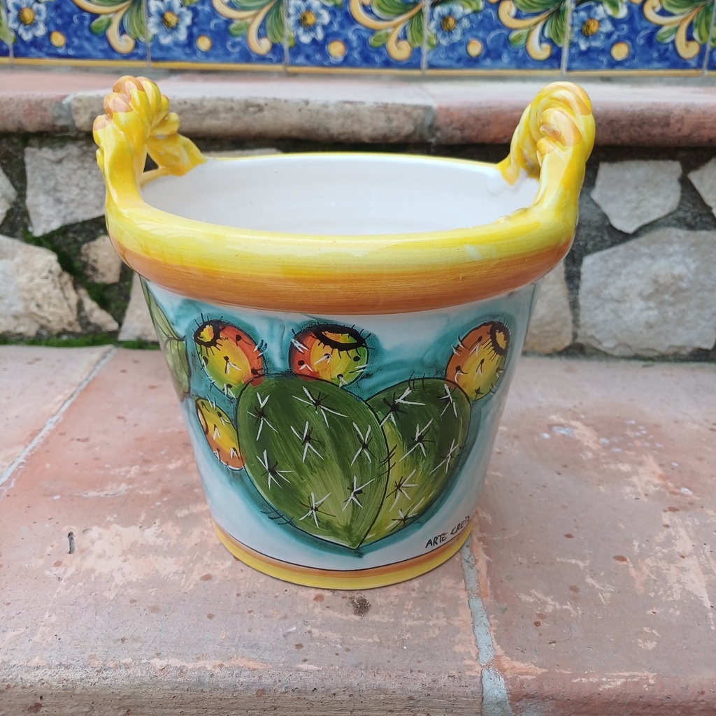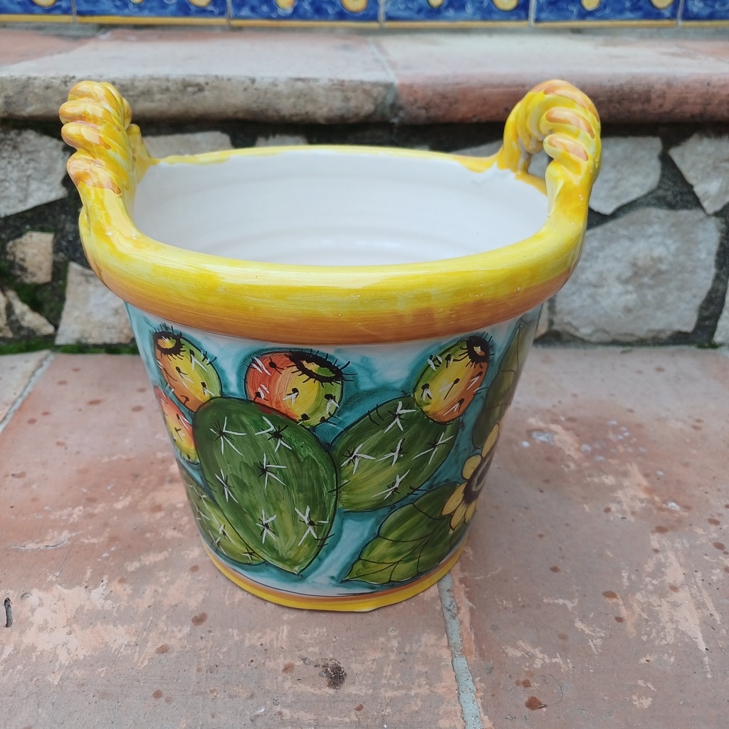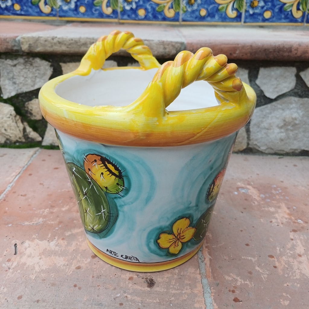 cesto 2 manici decoro fichi d’india e girasoli ø20 cm h.20 cm. Ceramiche realizzate a mano, in maniera del tutto artigianale, da Arte Creta – Ceramiche Artistiche Siciliane – Caltanissetta, Sicilia.