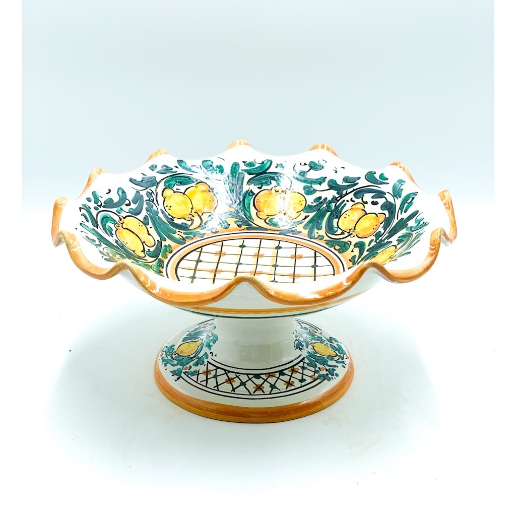 Fruttiera Centrotavola con piede decoro limoni ø30 h.16 cm. Ceramiche realizzate a mano, in maniera del tutto artigianale, da Arte Creta – Ceramiche Artistiche Siciliane – Caltanissetta, Sicilia.