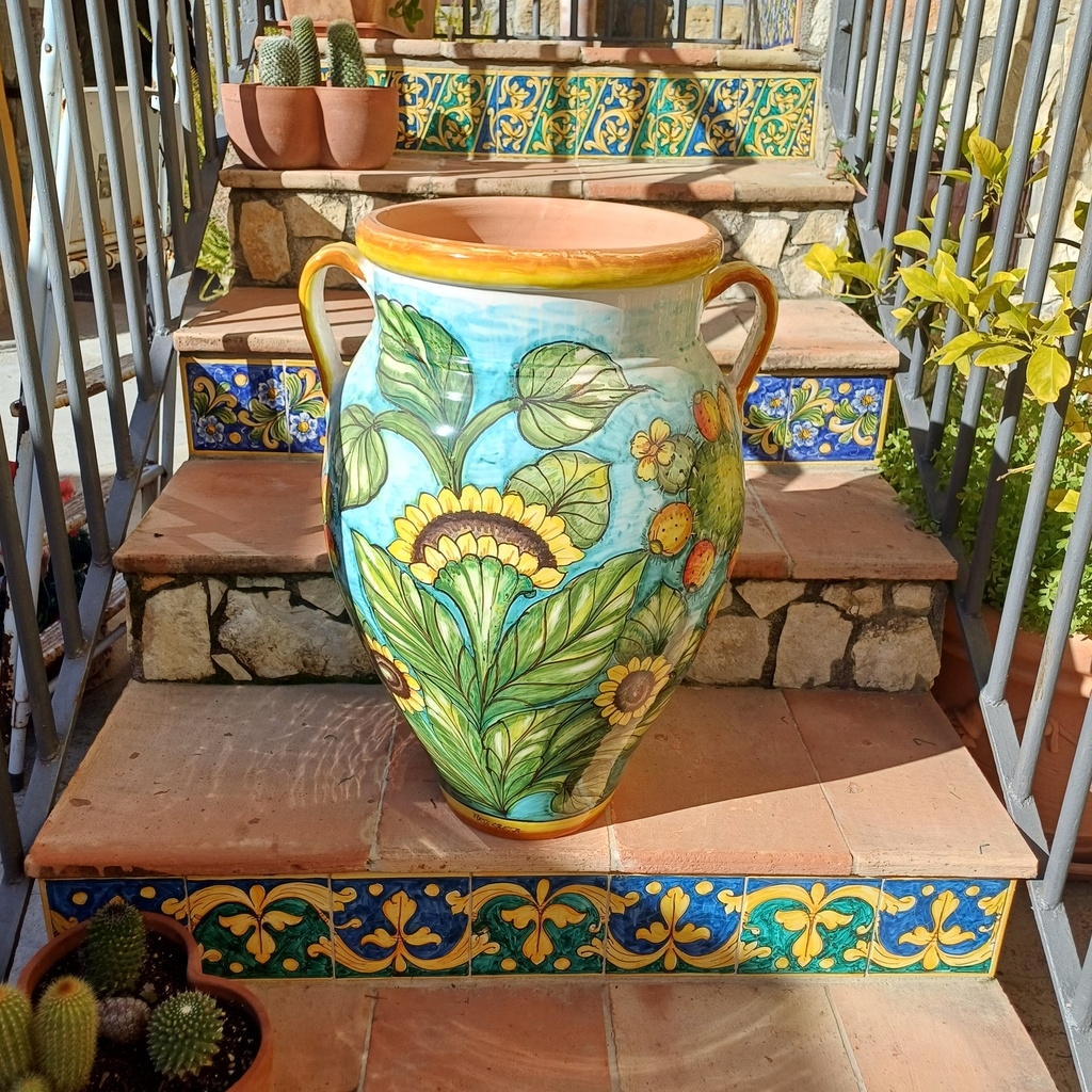 Giara siciliana decoro fichi d’india e girasoli ø40 h.65 cm. Ceramiche realizzate a mano, in maniera del tutto artigianale, da Arte Creta – Ceramiche Artistiche Siciliane – Caltanissetta, Sicilia.