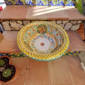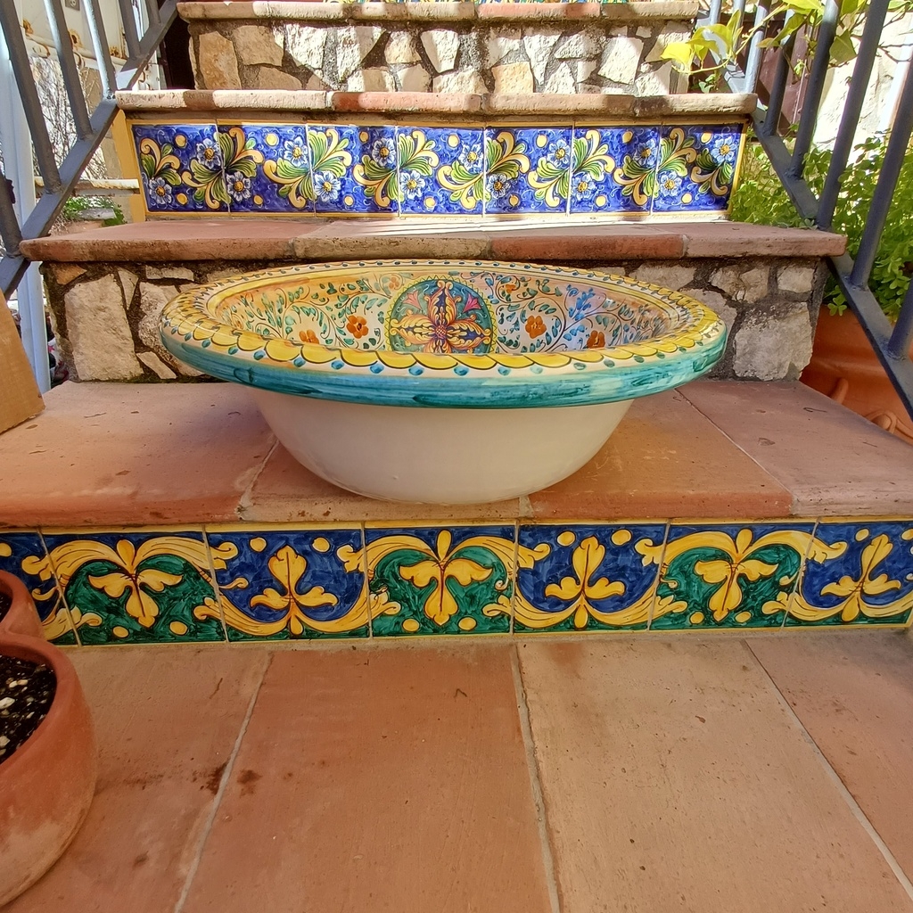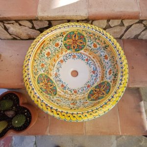 Lavello bombato da incasso decoro geometrico verde ø48 h.17 cm. Ceramiche realizzate a mano, in maniera del tutto artigianale, da Arte Creta – Ceramiche Artistiche Siciliane – Caltanissetta, Sicilia.