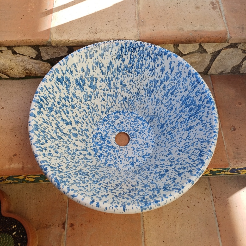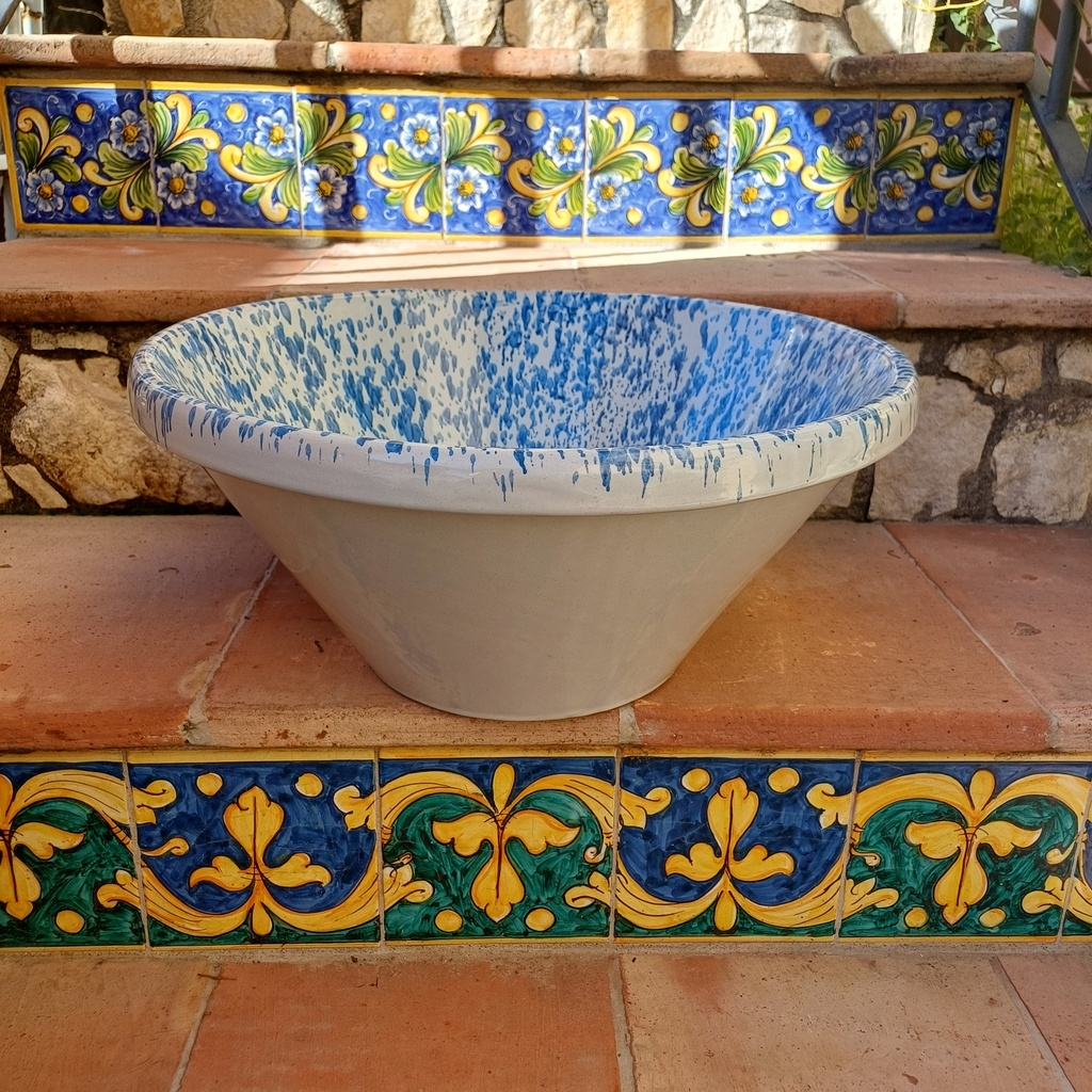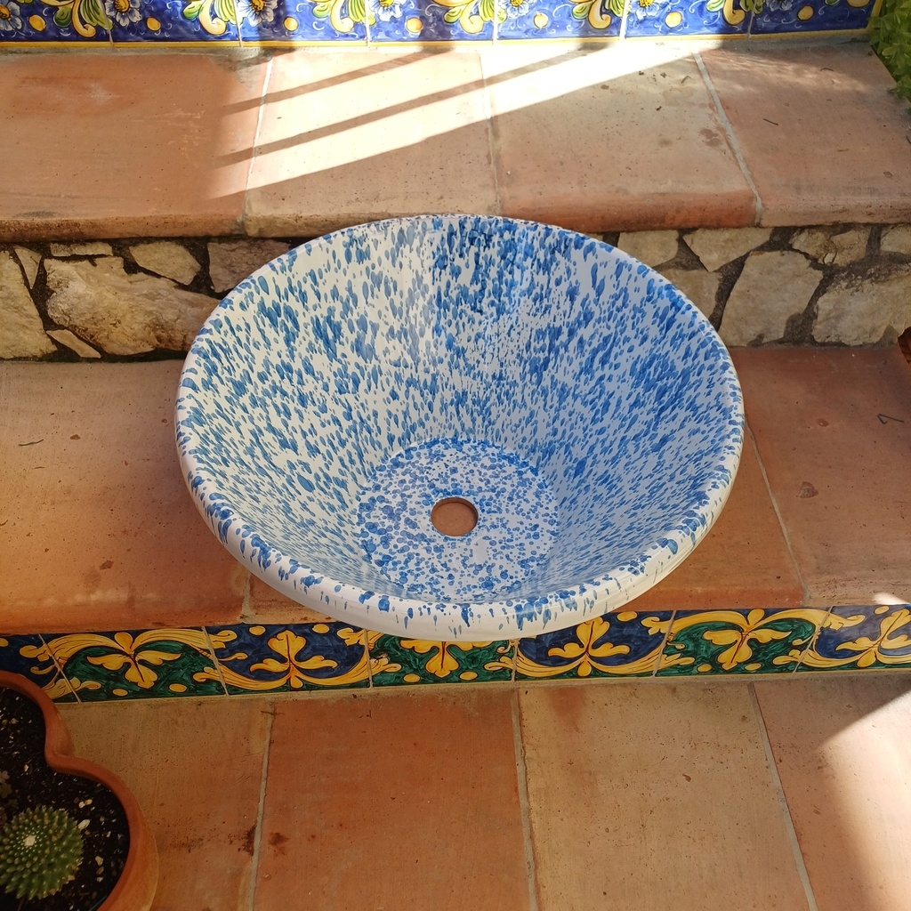 Lavello da incasso screziato blu ø44 h.20 cm. Ceramiche realizzate a mano, in maniera del tutto artigianale, da Arte Creta – Ceramiche Artistiche Siciliane – Caltanissetta, Sicilia.