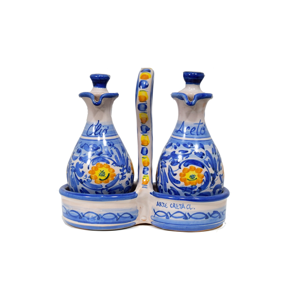 Olio e aceto a cestello 18 cm (h) x cm 19. Ceramiche realizzate a mano, in maniera del tutto artigianale, da Arte Creta – Ceramiche Artistiche Siciliane – Caltanissetta, Sicilia.