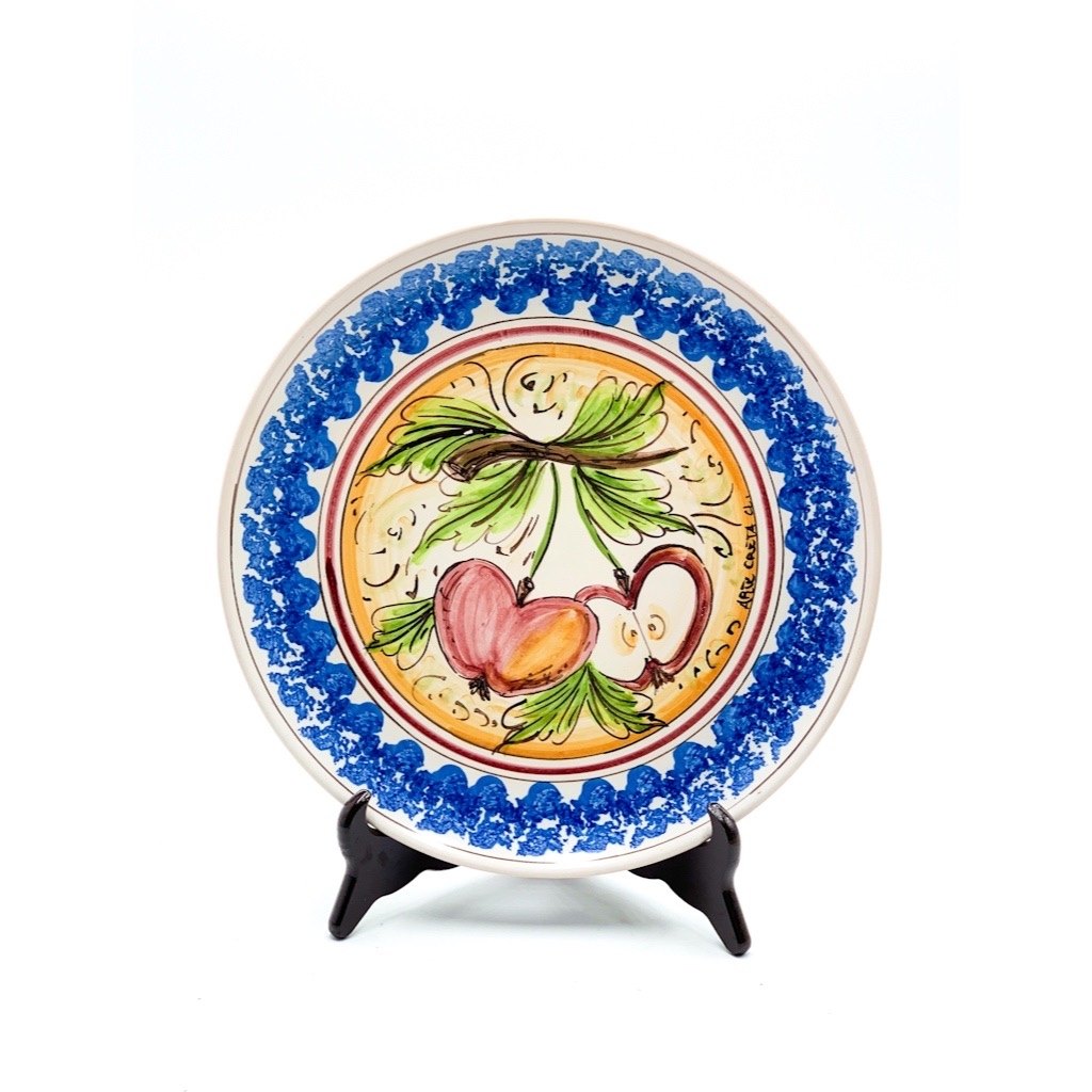 Piatto ceramica decoro mele bordo blu ø31 cm. Ceramiche realizzate a mano, in maniera del tutto artigianale, da Arte Creta – Ceramiche Artistiche Siciliane – Caltanissetta, Sicilia.