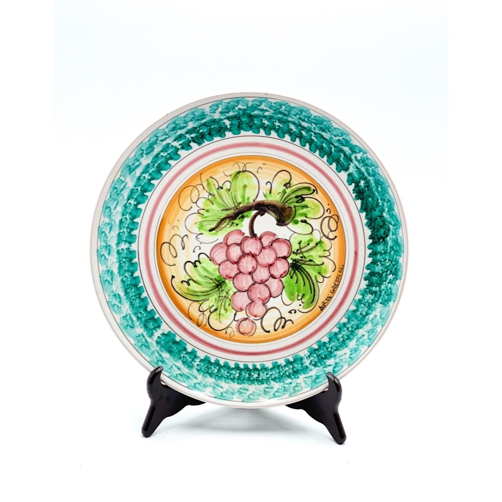 Piatto ceramica decoro uva bordo verde ø31 cm. Ceramiche realizzate a mano, in maniera del tutto artigianale, da Arte Creta – Ceramiche Artistiche Siciliane – Caltanissetta, Sicilia.