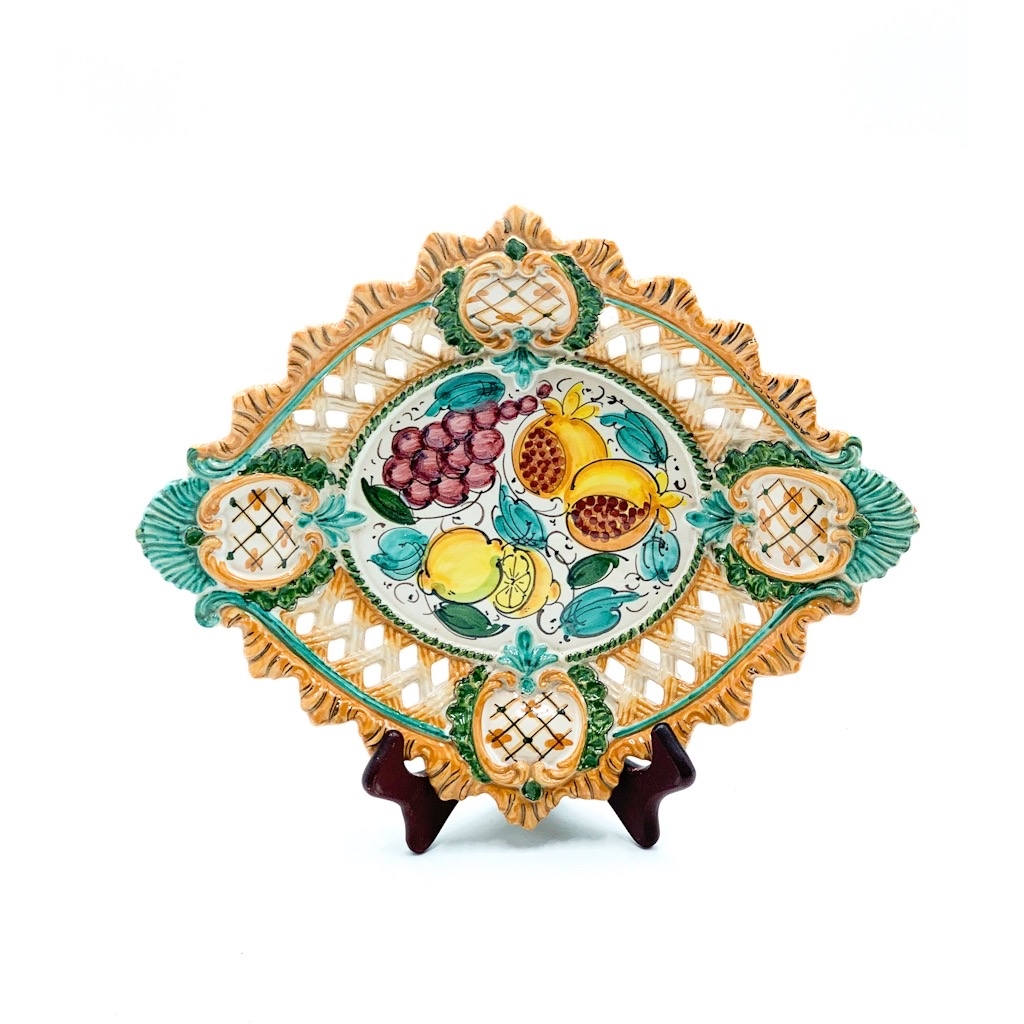 Piatto ceramica ovale traforato decoro uva limone e melograno cm.36×30. Ceramiche realizzate a mano, in maniera del tutto artigianale, da Arte Creta – Ceramiche Artistiche Siciliane – Caltanissetta, Sicilia.
