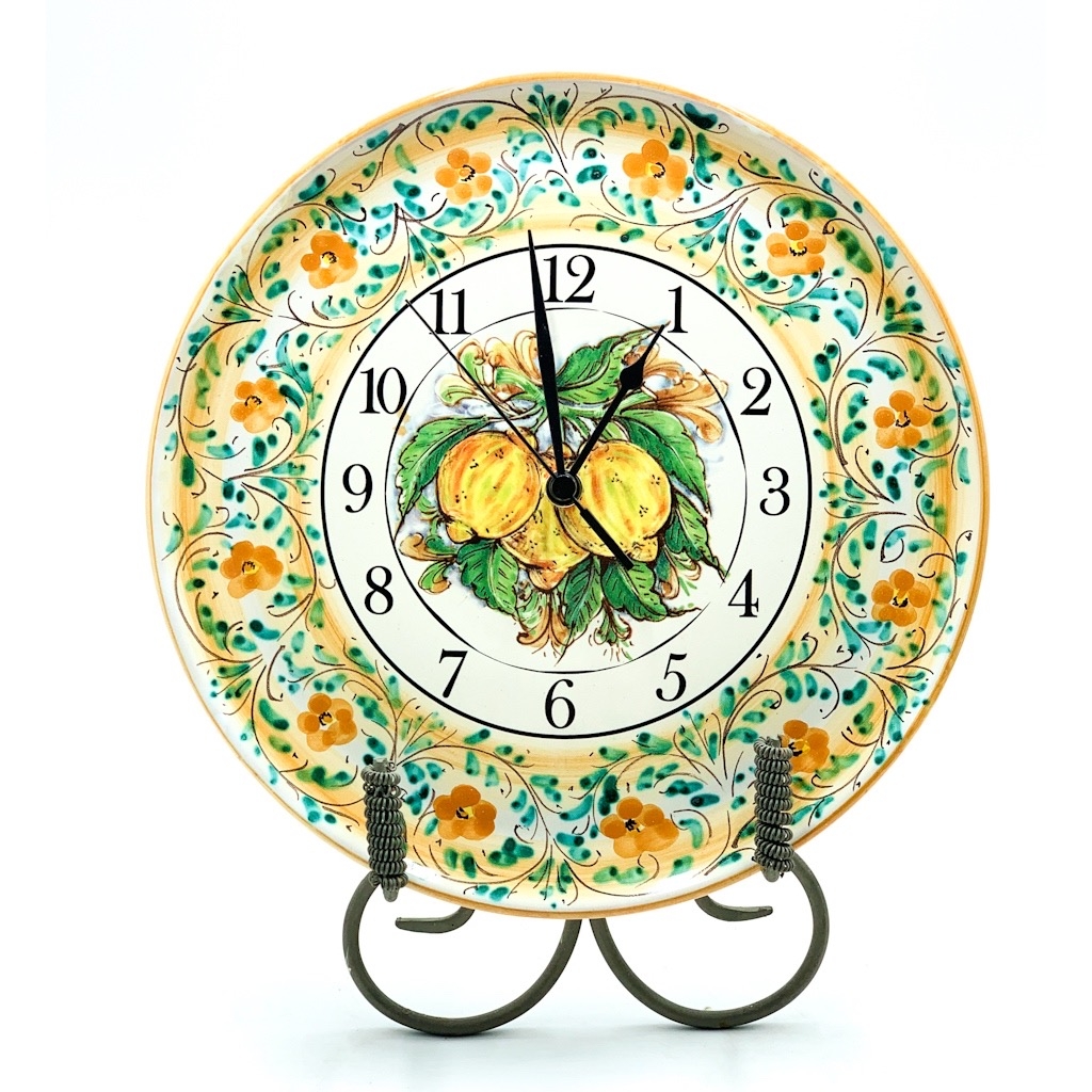Piatto Orologio ceramica decoro 3 limoni ø31 cm. Ceramiche realizzate a mano, in maniera del tutto artigianale, da Arte Creta – Ceramiche Artistiche Siciliane – Caltanissetta, Sicilia.