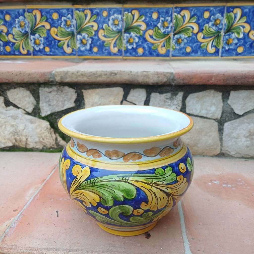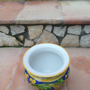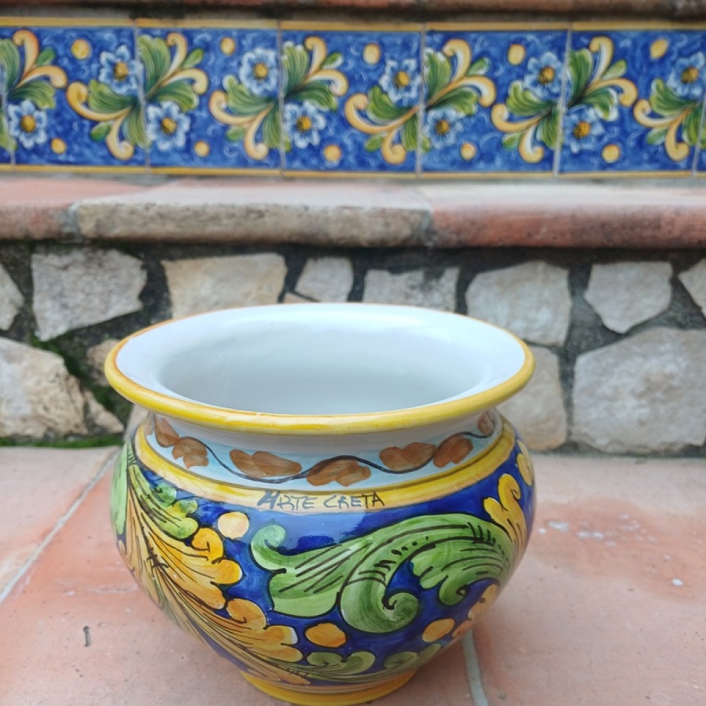 Porta vaso con decoro blu 26 cm (h) – ø cm 30. Ceramiche realizzate a mano, in maniera del tutto artigianale, da Arte Creta – Ceramiche Artistiche Siciliane – Caltanissetta, Sicilia.