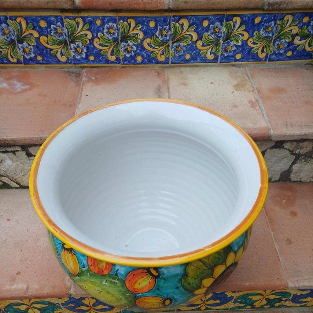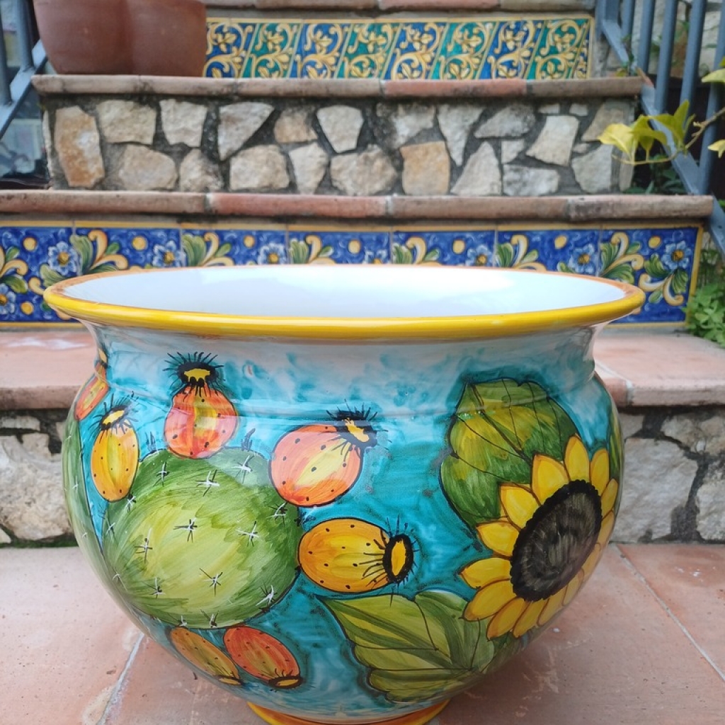 Porta vaso con decoro fichi d’india e girasoli cm30 (h) – ø cm 39. Ceramiche realizzate a mano, in maniera del tutto artigianale, da Arte Creta – Ceramiche Artistiche Siciliane – Caltanissetta, Sicilia.