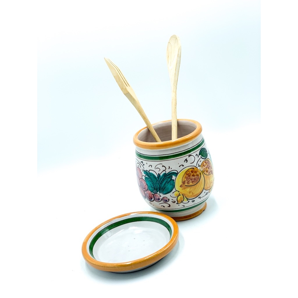 Scolaposate Con Piattino decoro Uva Limoni Melograni ø14 h.17 cm. Ceramiche realizzate a mano, in maniera del tutto artigianale, da Arte Creta – Ceramiche Artistiche Siciliane – Caltanissetta, Sicilia.
