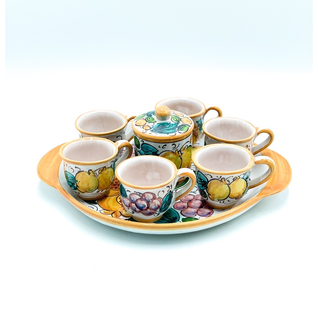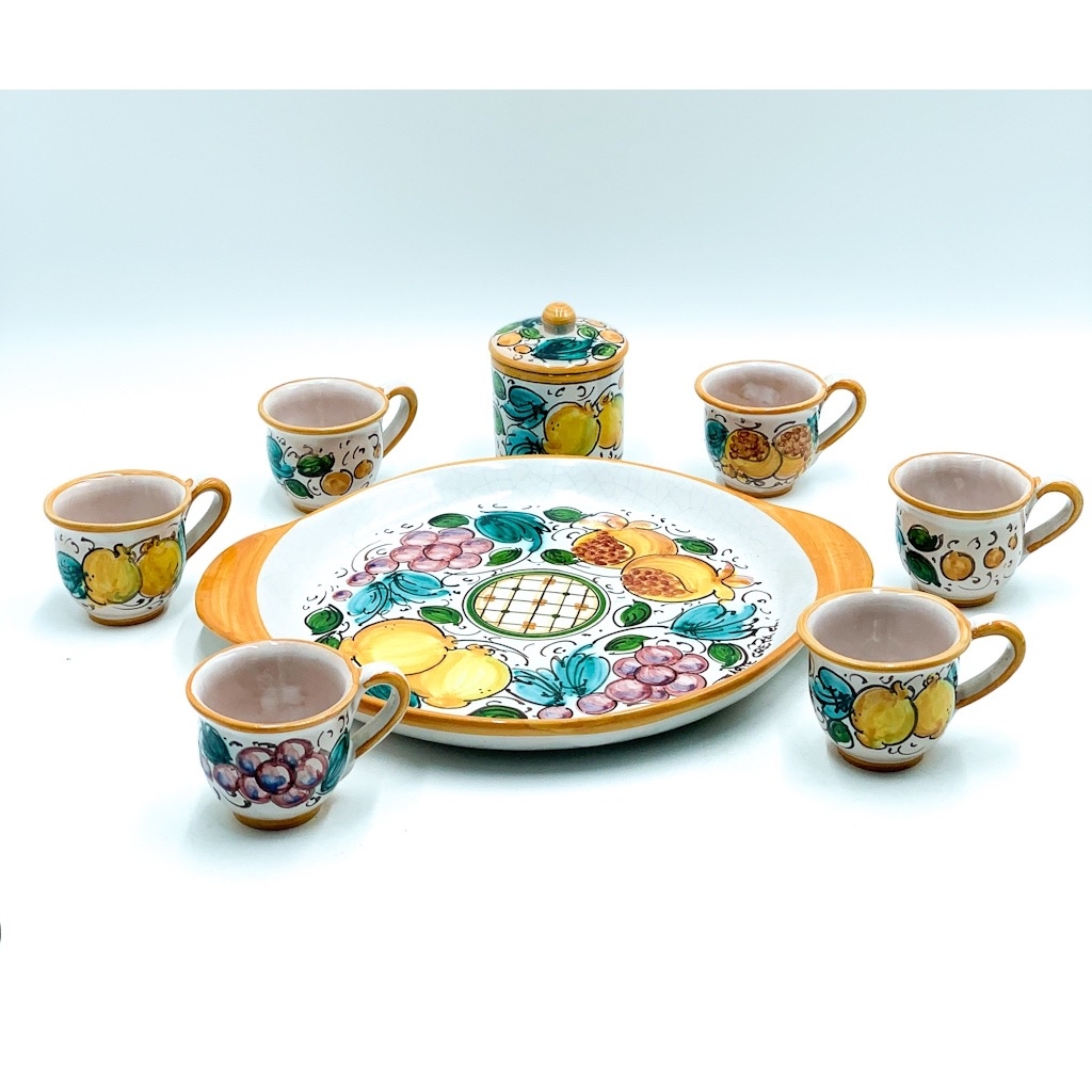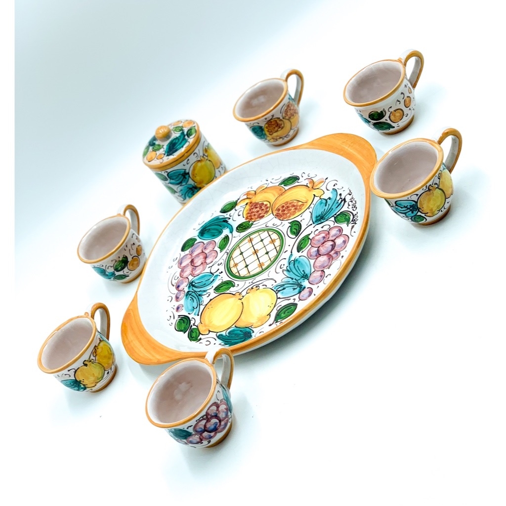 Servizio Caffè 6 Tazzine + Zuccheriera decoro Uva Limoni Melograni ø25 cm. Ceramiche realizzate a mano, in maniera del tutto artigianale, da Arte Creta – Ceramiche Artistiche Siciliane – Caltanissetta, Sicilia.