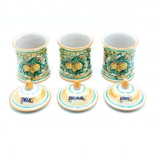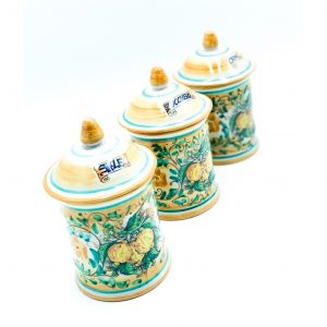 Tris Barattoli Sale Zucchero Caffè Decoro 3 Limoni ø10 h.17 cm. Ceramiche realizzate a mano, in maniera del tutto artigianale, da Arte Creta – Ceramiche Artistiche Siciliane – Caltanissetta, Sicilia.