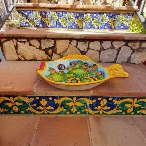 vassoio pesce decoro fichi d’india e girasoli cm.42×35 h.9 cm. Ceramiche realizzate a mano, in maniera del tutto artigianale, da Arte Creta – Ceramiche Artistiche Siciliane – Caltanissetta, Sicilia.